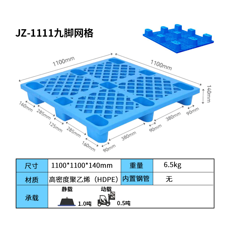 九腳網(wǎng)格塑料托盤的九腳網(wǎng)格托盤其底部是有‘九個腿’組成的,表面為‘網(wǎng)格’狀,行業(yè)為方便稱其為九腳網(wǎng)格托盤,九腳網(wǎng)格托盤大多型號的都為輕型的塑料托盤,不易用于上貨架或者較重貨物的周轉(zhuǎn)使用,大多情況下九腳網(wǎng)格塑料托盤都是用來倉庫貨物墊倉板防潮使用,對于輕型貨物的周轉(zhuǎn)也可