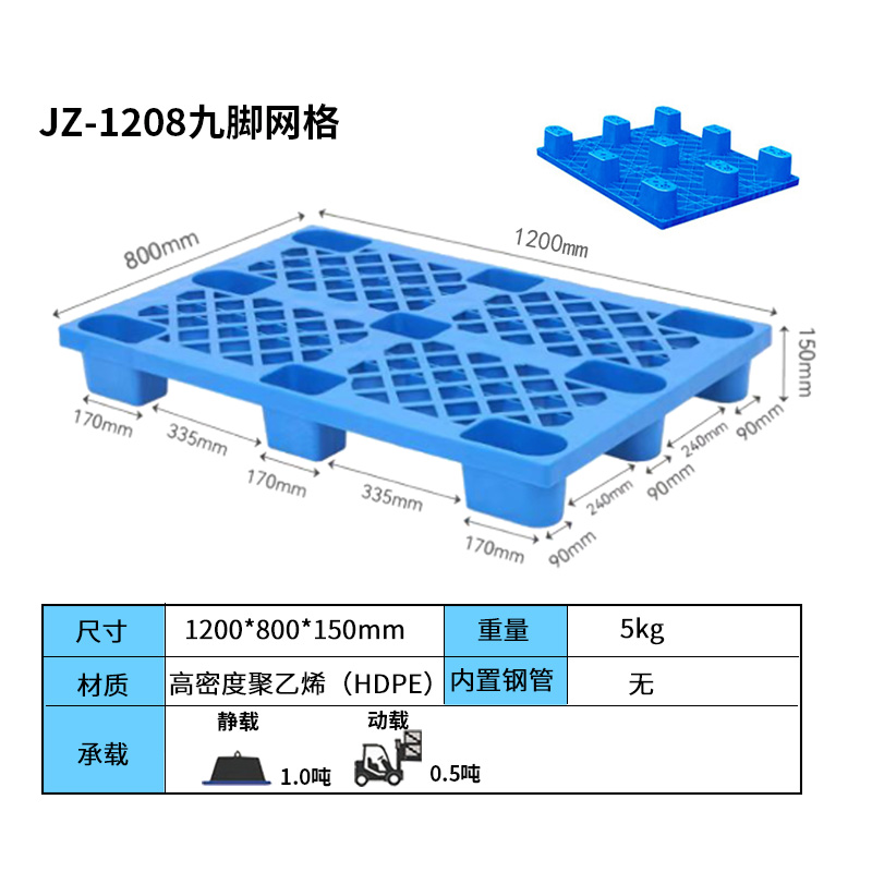 九腳網(wǎng)格塑料托盤(pán)的九腳網(wǎng)格托盤(pán)其底部是有‘九個(gè)腿’組成的,表面為‘網(wǎng)格’狀,顧行業(yè)為方便稱其為九腳網(wǎng)格托盤(pán),九腳網(wǎng)格托盤(pán)大多型號(hào)的都為輕型的塑料托盤(pán),不易用于上貨架或者較重貨物的周轉(zhuǎn)使用,大多情況下九腳網(wǎng)格塑料托盤(pán)都是用來(lái)倉(cāng)庫(kù)貨物墊倉(cāng)板防潮使用,對(duì)于輕型貨物的周轉(zhuǎn)也可。