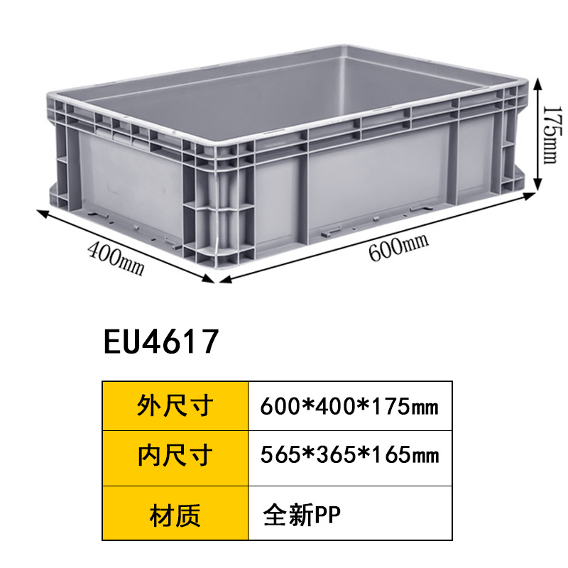 EU物流箱采用全新pp材質(zhì),采用先進(jìn)的生產(chǎn)工藝注塑而成,具有周轉(zhuǎn)方便,碼垛整齊,便于管理的特點;規(guī)格多樣,常與塑料托盤及貨架等倉儲設(shè)備配合使用應(yīng)用廣泛, 主要應(yīng)用于物流運(yùn)輸、倉儲管理、生產(chǎn)加工、零部件存儲與運(yùn)輸、廢棄物處理及產(chǎn)品展示等多個領(lǐng)域
