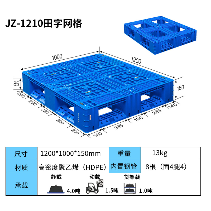 田字設(shè)計(jì),雙層加強(qiáng)受力,增加托盤受力強(qiáng)度,使受力更加均勻,結(jié)構(gòu)牢固,不易變形。完美無障礙平地堆碼,疊放易于整理存放,也可節(jié)約存儲空間,符合空間資源合理配置要求??伤南蜻M(jìn)叉,操作方便,多面進(jìn)叉可防止托盤變形,增加使用壽命網(wǎng)格表面在產(chǎn)品置放部位安裝防滑塊,提高產(chǎn)品使