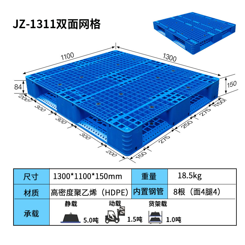 雙面網(wǎng)格塑料托盤其特點(diǎn)是正反兩面的結(jié)構(gòu)相同,均為網(wǎng)格狀,因此兩面都可以使用,故被稱為雙面網(wǎng)格塑料托盤。這種托盤通常應(yīng)用于食品廠、化工廠、化肥制造、冷庫等行業(yè)。雙面網(wǎng)格塑料托盤的插孔較低,因此不適合使用地牛拖車,在選擇使用時需要特別注意。根據(jù)成型工藝的不同,雙面網(wǎng)格塑料托盤可以分為一體成型雙面網(wǎng)格和焊接雙面網(wǎng)格托盤兩種類型。